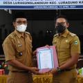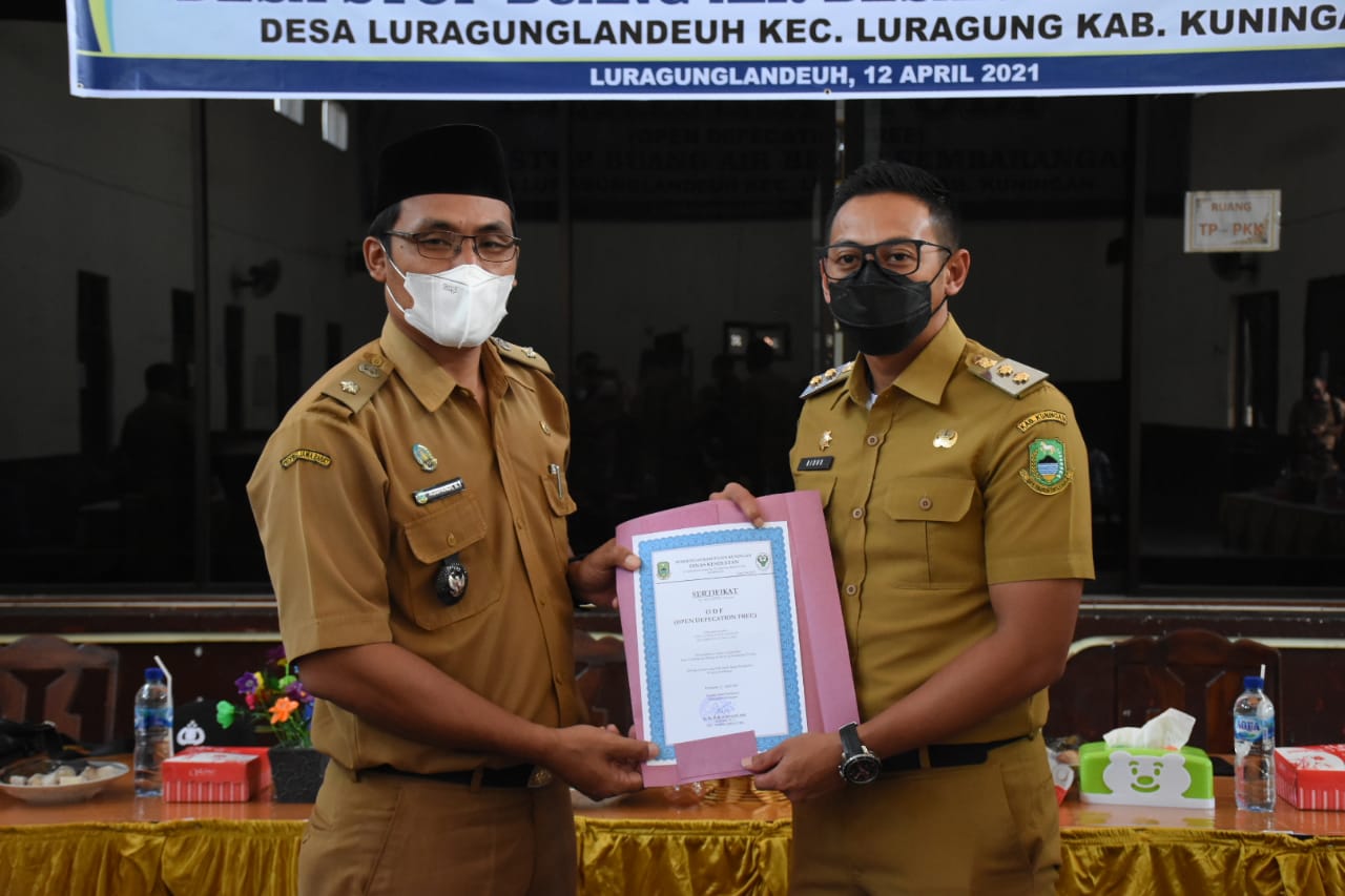 Wakil Bupati Kuningan H. M Ridho Suganda, SH., M.Si, menyerahkan sertifikat Desa "Open Defecation Free" (ODF) atau Desa Stop Buang Air Besar Sembarangan Kepada Kepala Desa Luragunglandeuh, Kecamatan Luragung, dalam acara Deklarasi Desa Luragunglandeuh sebagai Desa ODF, Senin (12/4/2021), di Aula kantor desa setempat.